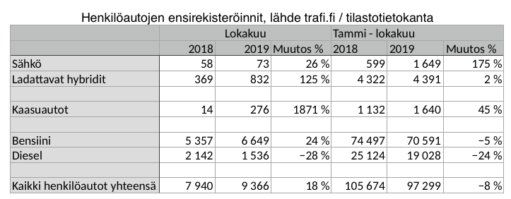 Lokakuu 2019 oli koko vuoden 2019 hiljaisin uusien sähköautojen ensirekisteröinneissä, vaikka kehitystä olikin mukavat 26%. Sen sijaan pluginhybridit nousivat nyt kaikkien aikojen ennätyslukemaansa, eli 832 uuden henkilöauton ensirkisteröintiin. Myös kaasuautot tekivät uusien henkilöautojen ensirekisteröinneissä kaikkien aikojen yksittäisen kuukauden ennätyksensä 276 kappaleellaan.