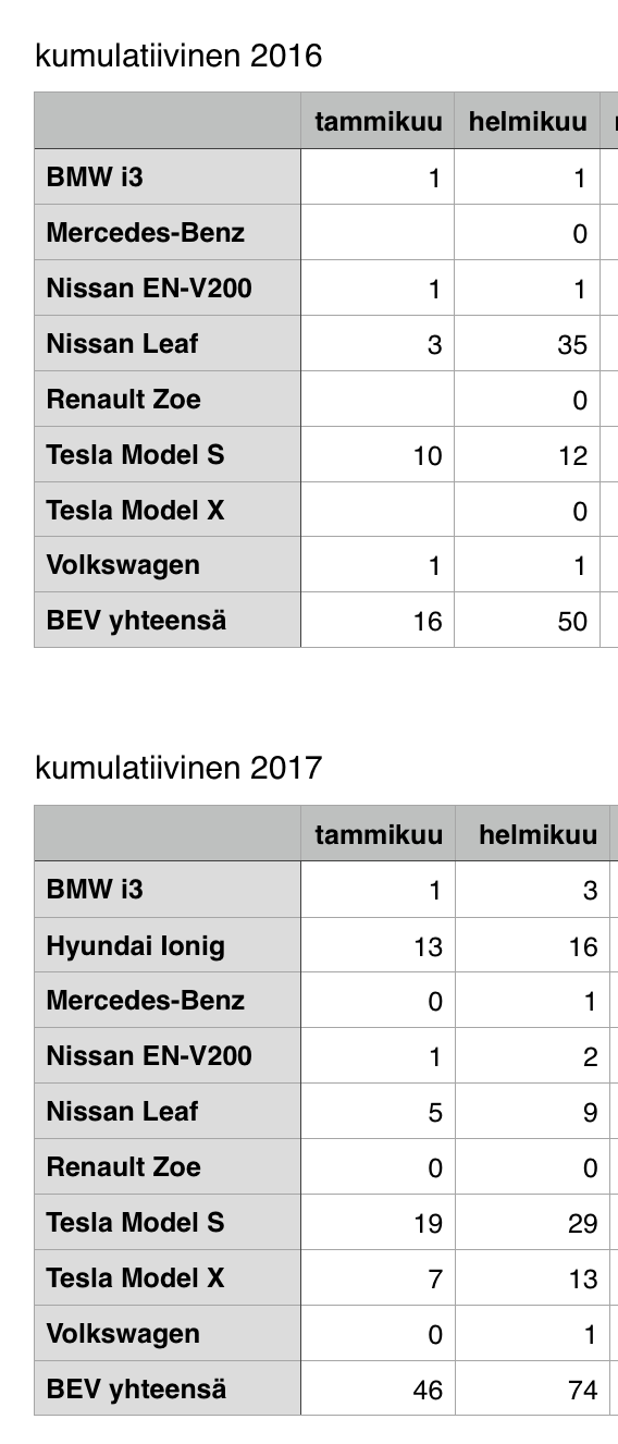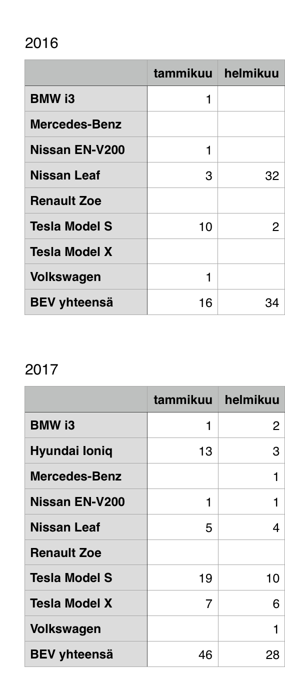 Pelkästään helmikuun määriä tarkastellessa sähköautojen kehitykseen merkittävän tilastoheiton tekee vuoden 2016 Leafien rekisteröintipiikki 35 kpl, joka todennäkoisesti oli suurelta osin 30 kWh mallien täyttämistä maahantuojan jälleenmyyntiverkostoon esittelyautoiksi. Helmikuun määrä vuonna 2017 oli 28 kpl, joka jäi siis edellisvuoden 34 kappaleesta.