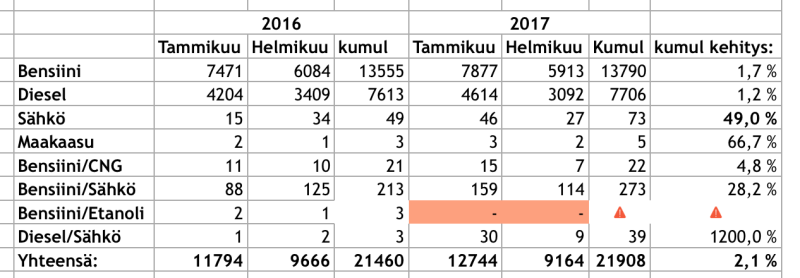 Täyssähköisten henkilöautojen ensirekisteröinnit olivat vielä tammi-helmikuun 2017 kumulatiivisessa tarkastelussa erinomaisella kehityksellä. Vuoden 2017 tammi-helmikuussa rekisteröitiin yhteensä 74 sähköautoa, kun edellisvuoden määrä oli 50 kpl.