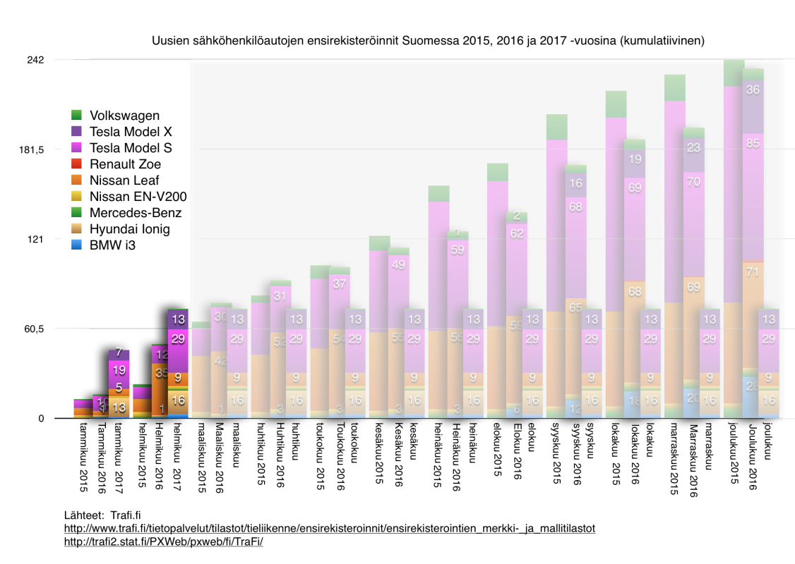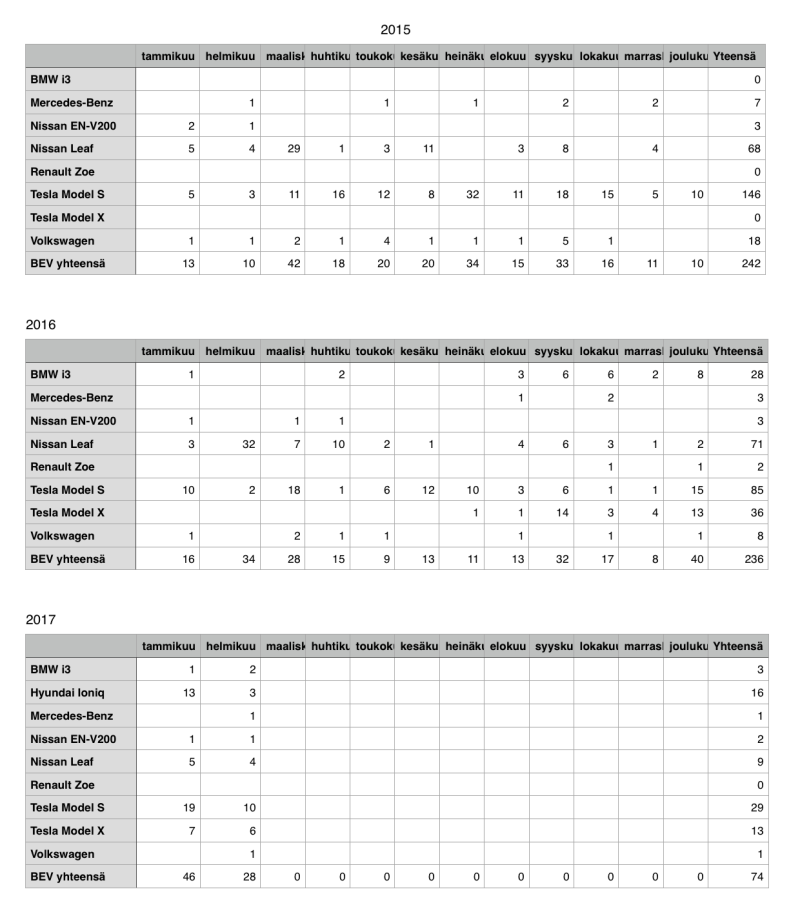 Teslan Model S -autoja rekisteröitiin helmikuussa 10 kpl ja X:iä 6 kpl, joten Tesla oli jälleen eniten rekisteröity sähköauto helmikuussa 2017.