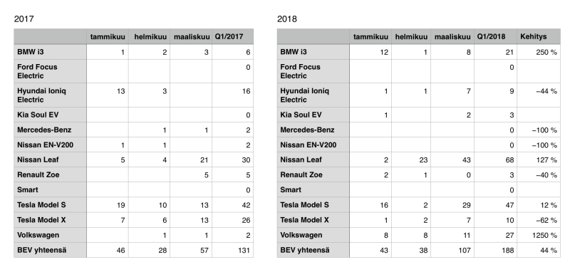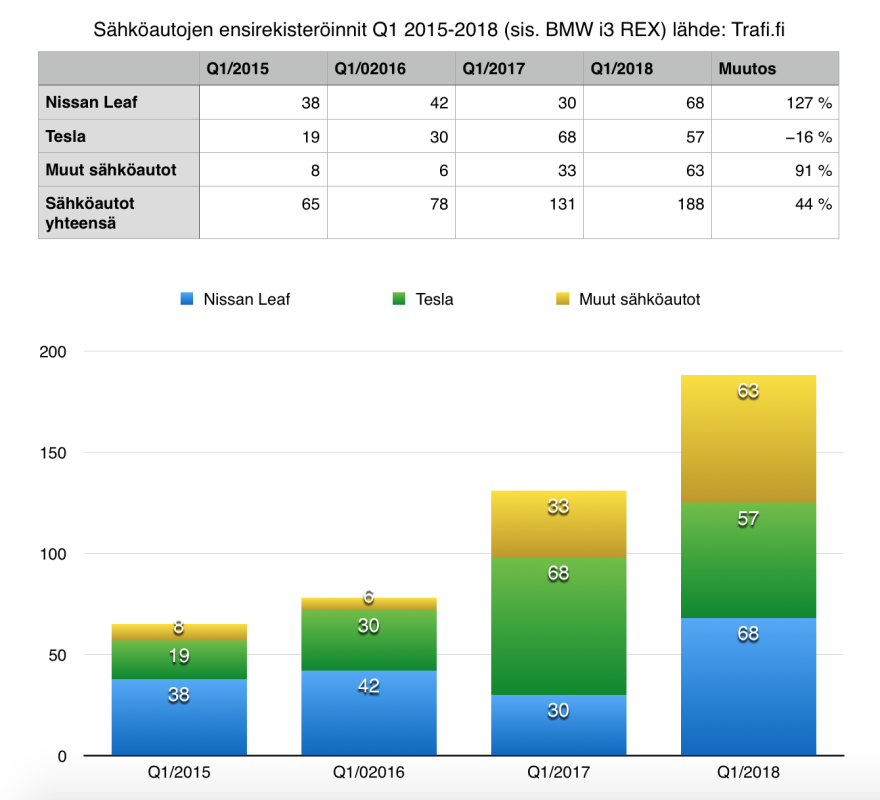 Vuoden 2018 ensimmäisen neljänneksen sähköautojen ensirekisteröinnit ovat kääntyneet jälleen vahvaan kehitykseen. Kaikkien sähköautojen ensirekisteröinnit kasvoivat Q1/2018 edellisestä vuodesta yli 40%. Leaf on suurin kasvattaja kappalemääräisesti, mutta nyt ensimmäisen kerran muitakin sähköautoja kuin Tesla ja Leaf on noussut merkittävämpiin määriin.