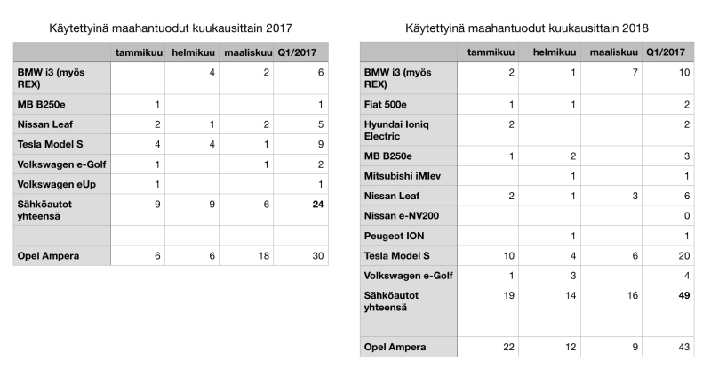 Käytettyinä tuotujen sähköautojen määrät ovat myös olleet alkuvuonna kovalla kehityksellä. Erityisesti Teslan Model S:iä ja BMW:n i3:sia on tuotu runsaasti. (Lähde: https://www.vero.fi/henkiloasiakkaat/auto/autoverotus/taulukoita_ajoneuvojen_sovelletuista_ve/