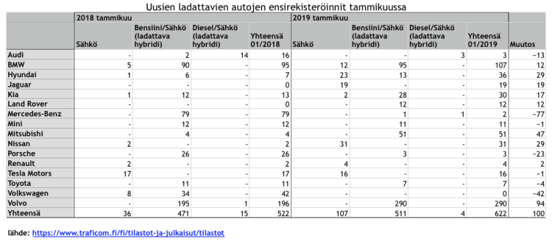 Kun mukaan tarkasteluun otetaan kaikki ladattavat ajoneuvot, eli sähköautojen lisäksi myös ladattavat bensiini- ja dieselhybridit, niin rekisteröintien kokonaismäärä oli 622 kpl, jossa oli kehitystä 100 kappaletta, eli 19% ja osuus kaikista tammikuussa rekisteröidyistä autoista oli 5,3%.