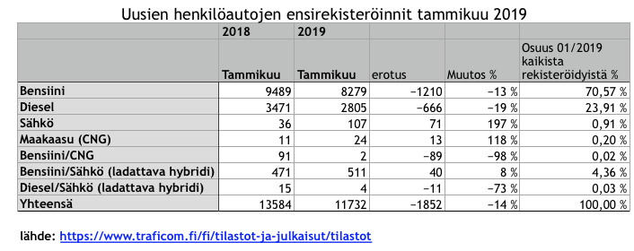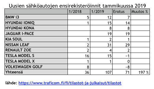 Tammikuussa 2019 ensirekisteröitiin yhteensä 107 uutta sähköautoa Suomessa, eli lähes 200% enemmän, kuin vuoden 2018 tammikuussa. Pidän kehitystä hyvänä etenkin kun huomioidaan muita energiamuotoja käyttäviin autoihin. Diesel- ja bensiiniautot nimittäin menettivät tuntuvasti rekisteröintimääriään. Kaasuautojen rekisteröintimäärät olivat molempien vuosien tammikuussa kovin alhaisella tasolla ja arvelen tämän vuoden osalta syynä olevan edelleen vaihdoksessa olevan tarjooman.
