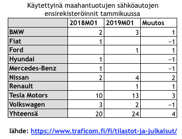 Käytettyinä maahantuotuja sähköautoja rekisteröitiin tammikuussa yhteensä 24 kappaletta ja näistä enemmän kuin joka toinen oli Tesloja. Käytettyjen Teslojen maahantuonti on ymmärrettävää, koska Euroopassa käytettyjen tarjonta on merkittävästi runsaampaa kuin Suomessa ja sähköautoista peritään myös käytettynä tuodessa varsin maltillinen vero.
