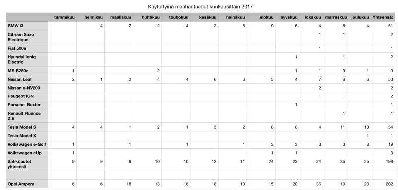 Käytettynä tuotujen yksittäismaahantuotujen sähköautojen verotuspäätöksiä kirjattiin vuonna 2017 myös peräti 198 kappaletta. Näiden lisäksi Opel Amera -hybridejä kirjattiin peräti 202 kpl.
