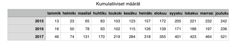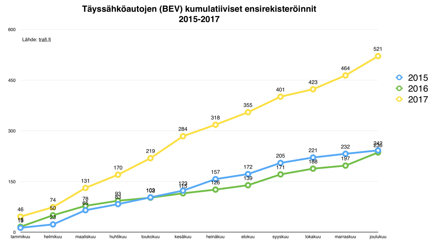 Täyssähköisten henkilöautojen ensirekisteröintien määrä (521kpl) yli tuplaantui vuonna 2017 verrattuna vuoteen 2016 (236kpl). Kehitystä oli siis noin 120%.
