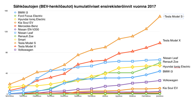 Lähteet: Trafi Tilastotietokanta Henkilöautojen ensirekisteröinnit 2015 - 2017 ja Trafi Ensirekisteöintien merkki- ja mallikohtaiset tilastot 2017