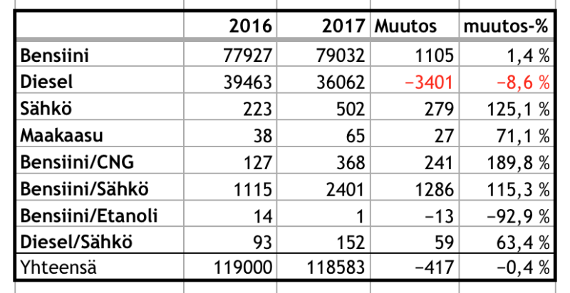 Vaihtoehtoisia energiamuotoja käyttävien ajoneuvojen rekisteröintimäärien kasvu näyttäisi olevan pois erityisesti diesel-autojen rekiseröintimääristä. Myös hybridiautojen määrä on ollut vahvassa nousussa. Silti sähköautoilla on edelleen hyvin marginaalinen osuus uusien autojen ensirekisteröineistä.