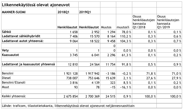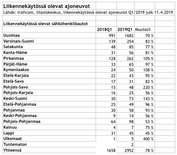 Sähköautojen kanta jatkaa päämäärätietoista kehittymistään, vaikka osuus kaikista autoista edelleen onkin häviävän pieni. Q1/2019 Suomessa oli liikennekäyttöön rekisteröitynä yhteensä 2952 sähkökäyttöistä henkilöautoa. Kehitystä tuossa määrässä oli 78% ja se muodosti 0,1% osuuden kaikista liikennekäytössä olevista henkilöautoista.