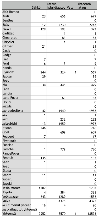 Volvo on 4375 autollaan yleisin kaikista lataushenkilöautoista ja Tesla on yleisin täyssähköuto 1207 kappaleellaan.