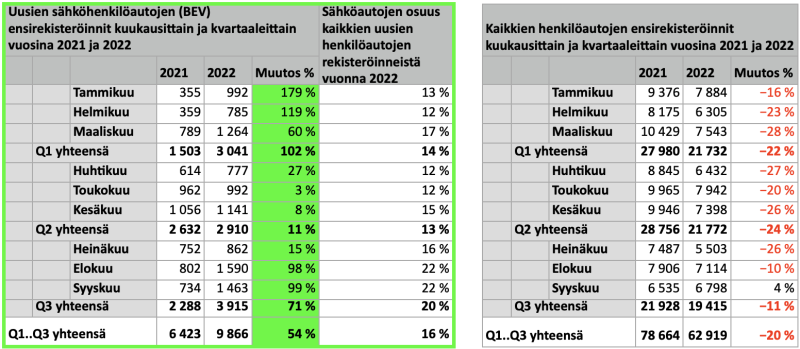 Q3/2022 lopussa tieliikennekäyttössä oli 39 074 sähköhenkilöautoa, mikä oli kaikista henkilöautoista 1,4 %. Nousua vuoden takaisesta Q3/2021 tilanteesta on tapahtunut 0,75 prosenttiyksikköä. Sähköhenkiöautojen kanta on noussut vuoden takaisesta 18 088 autosta 116 %.