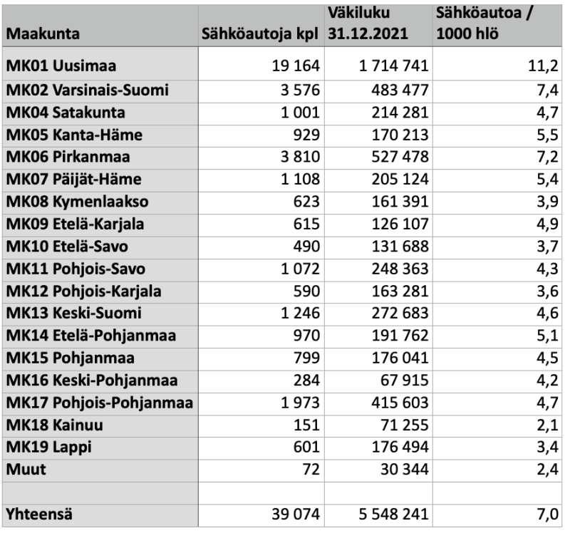 Viimeisessä taulukossa mielenkiintoinen suhdeluku olisi myös sähköautot vs kaikki alueen autot yhteensä