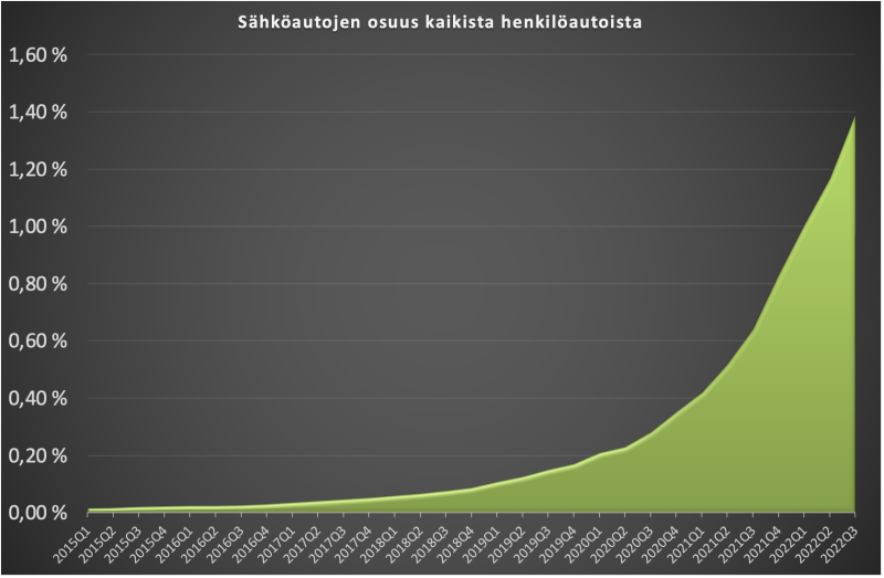 Kuvaajasta luen, että sähköautojen osuus autoista kaksinkertaistuu noin vuodessa. (0,2->0,4->0,8->1,6 %). Jos tätä menoa jatkuu, osuus ylittää 10 % vuonna 2025. Toki vauhti tulee hidastumaan jossain vaiheessa.