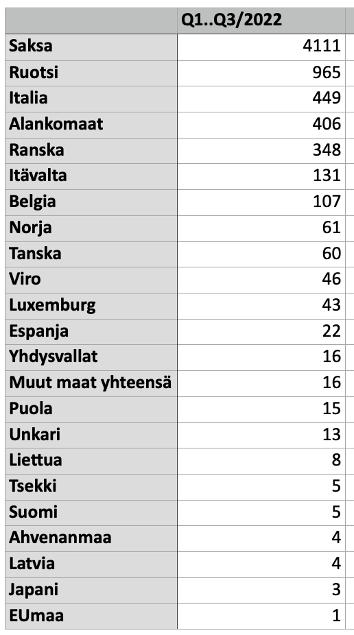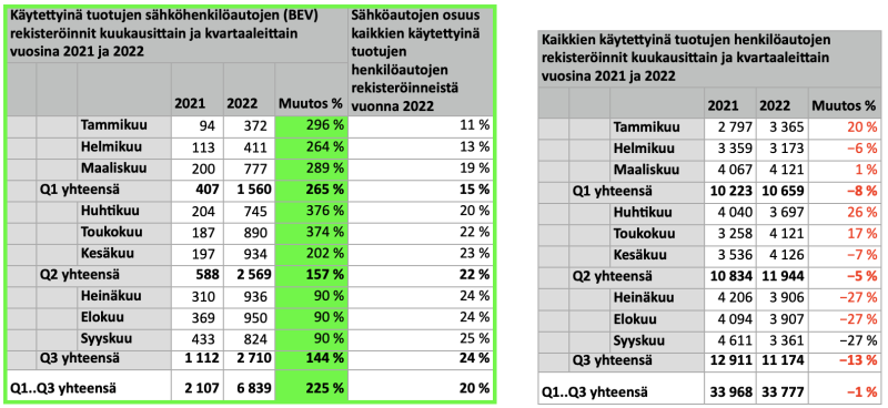 Q3/2022 rekisteröitiin Suomeen peräti 2 711 käytettynä tuotua sähköhenkilöautoa, jossa oli edelliseen vuoteen peräti 144 % kehitystä. Kaikista käytettyinä tuoduista henkilöautoista sähköautot olivat peräti 24 %, eli lähes neljänneksen Q3:lla. Kvartaalin sisällä heinäkuu oli siitä erityinen, että silloin tuotiin käytettyinä enemmän sähköautoja, kuin uusia rekisteröitiin.