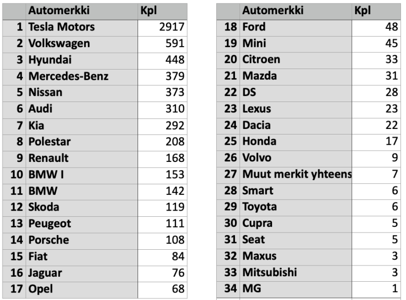Yleisin sähköautomerkki Suomessa on Tesla 10 114 autollaan. Volkswagen Groupin merkit yhteenlaskien, niitä on hieman enemmän, kuin Tesloja. Muut merkit ja konsernit jäävät selkeästi kauemmaksi näistä.