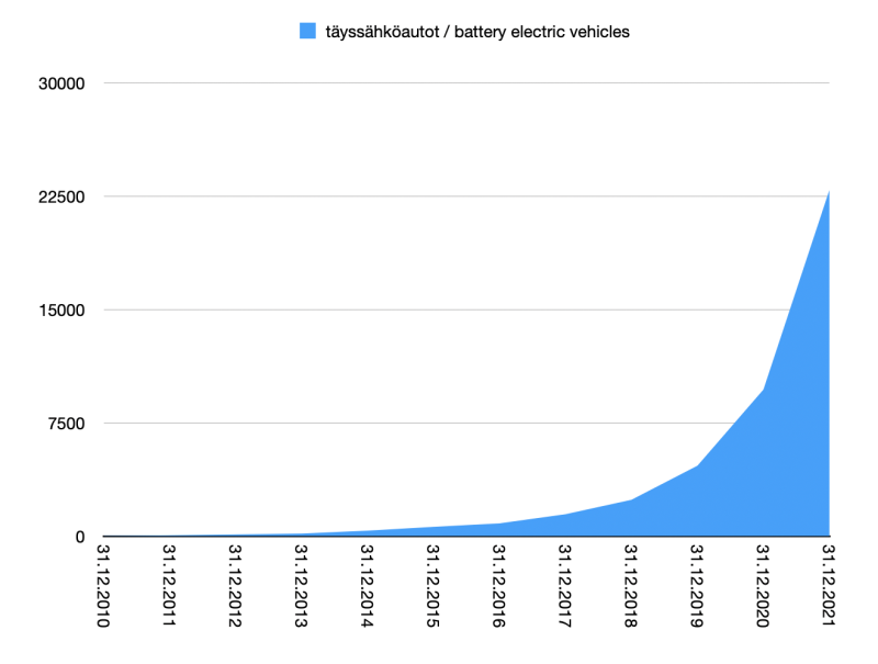 Vuoden 2021 lopussa sähköautoja oli 0,83 % tieliikennekäyttöön rekisteröidyistä autoista Suomessa ja lukumääränä se tarkoitti 22 892 kappaletta. Pluginhybrideitä oli 77 045 kappaletta. Vaikka sähköautojen osuus tieliikennekäyttöön rekisteröidyistä autoista on vielä alle prosentin, on nousuvauhti nyt erittäin kova ja ensi vuoden aikana tullaan ylittämään prosentin raja.