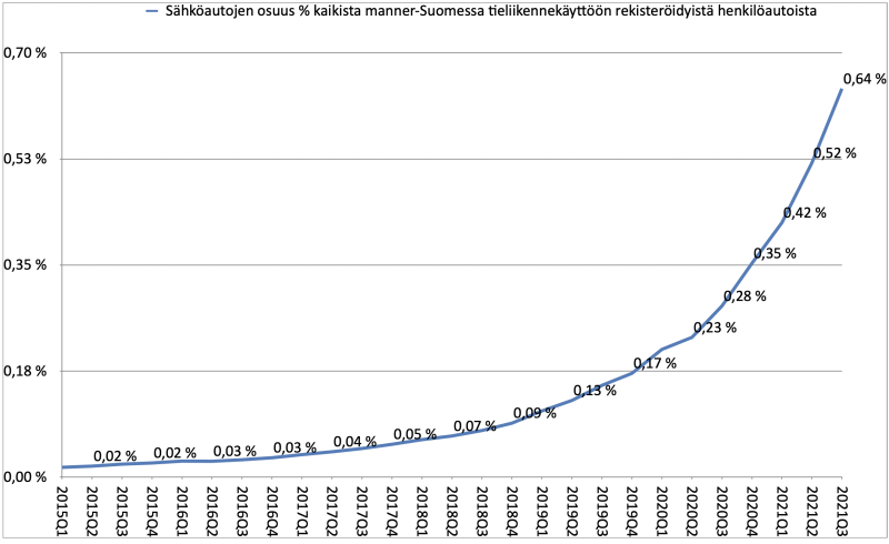Ajoneuvokanta uusiutuu kuitenkin Suomessa huomattavasti hitaammin. Q3/2021 sähköautojen osuus kaikista manner-Suomessa tieliikennekäytössä olevista henkilöautoista kiipesi jyrkällä käyrällä 0,64% tasolle. Edelleen ollaan siis alle prosentin luokassa.