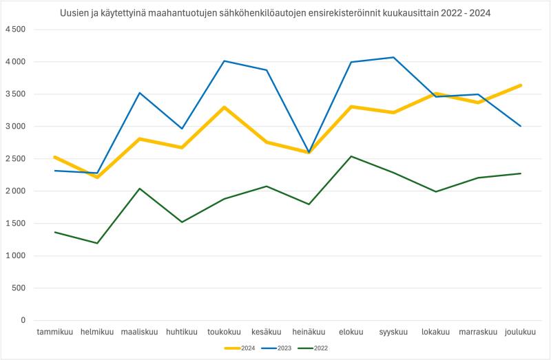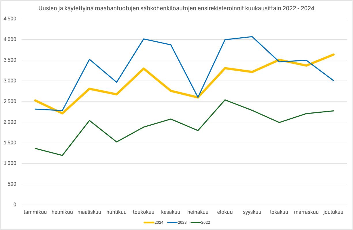 Uusina ensirekisteröityjen ja käytettyinä maahantuotujen henkilöautojen määrät yhteenlaskettuna jäivät vuoden mittaan muutamaa kuukautta lukuunottamatta vuoden 2023 lukujen alapuolelle. Koko vuonna 2024 sähköautoja rekisteröitiin uusina ja käytettyinä Suomessa yhteensä 35 916 kpl, mikä oli 9 prosenttia vähemmän kuin vuonna 2023.