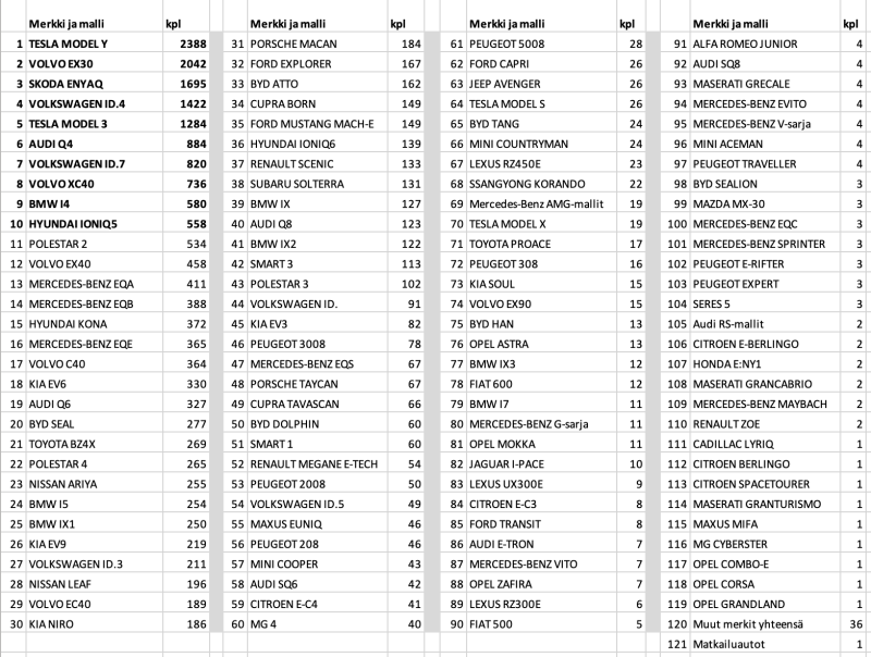 Tesla Model Y oli koko vuoden eniten rekisteröity sähköhenkilöautomalli Suomessa. Kakkoseksi vuoden 2024 tilastossa pomppasi edellisvuoden joulukuun tulokas EX30. Kolmossija oli Skoda Enyaqilla. Kaikenkaikkiaan Suomessa ensirekisteröitiin vuoden 2024 aikana noin 120 eri mallista sähköautoa. Tarjonta on siis kasvanut erittäin runsaasti viime vuosina.