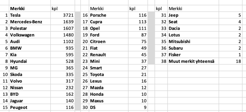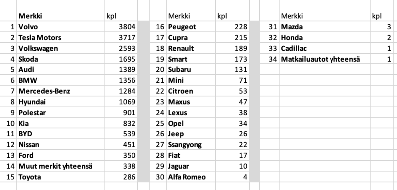 Uusina ja käytettyinä maahantuodut yhteenlaskettuna sähköautoista eniten Suomeen rekisteröitiin viime vuonna Tesloja 7438 kpl, joit muuten rekisteröitiin käytettyinä enemmän kuin uusia. Volvoja rekisteröitiin käytettyinä ja uusina yhteensä 4121 kpl, Volkkareita 4073 kpl ja Mersuja 2923 kpl