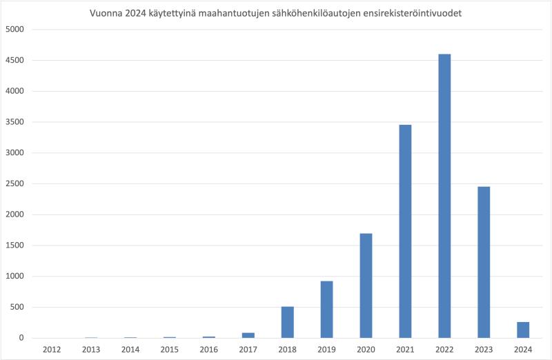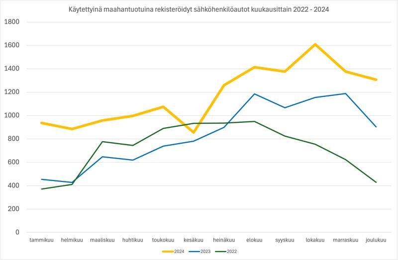 Vaikka uusien sähköhenkilöautojen ensirekisteröinnit olivat vuoden mittaan alavireessä, niin käytettyjen maahantuonti sen sijaan oli vuonna 2024 joka kuukausi edellisvuotta paremmalla tasolla. Koko vuonna Suomeen rekisteröitiin 14 048 käytettynä maahantuotua sähköhenkilöautoa, mikä oli peräti 40 prosenttia enemmän kuin vuonna 2023. Määrä oli samalla 32 prosenttia kaikista käytettyinä maahantuotujen henkilöautojen rekisteröinneistä.