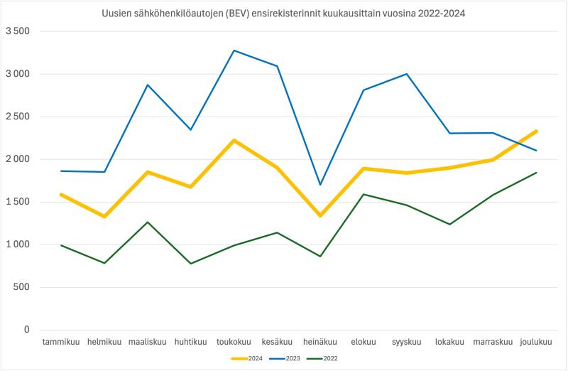 Vuonna 2024 sähköhenkilöautojen (BEV) ensirekisteröinnit olivat joka kuukausi viime edellisvuotta matalammalla tasolla kunnes joulukuu teki poikkeuksen. Joulukuussa 2024 ensirekisteröitiin Suomessa 2329 uutta sähköhenkilöautoa, mikä oli 37 prosenttia kaikista kuukauden aikana ensirekisteröidyistä henkilöautoista. Kasvua edellisen vuoden joulukuusta oli 11 prosenttia, kun kaikkien henkilöautojen ensrekisteröintien kehitys oli samaan aikaan 8 prosenttia.
