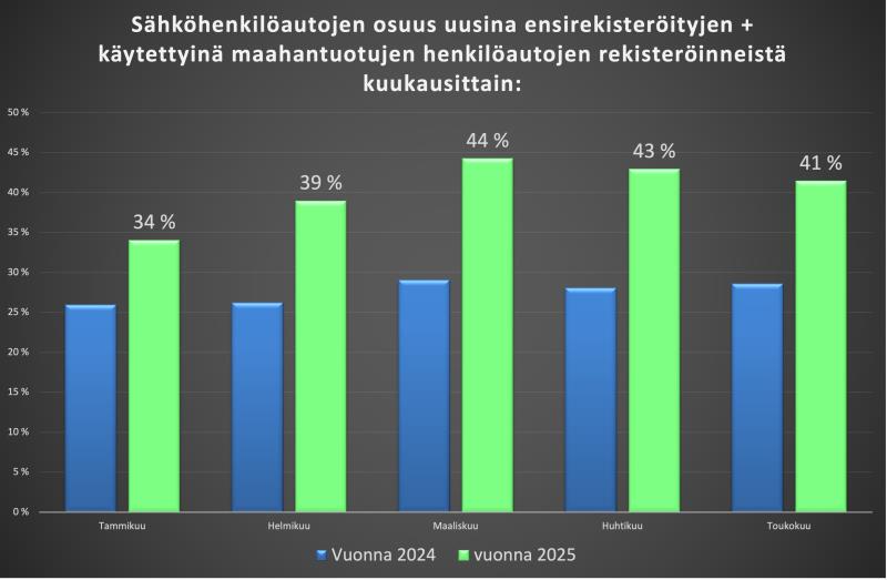 Vuoden 2025 alusta toukokuun 2025 loppuun mennessä Suomessa on rekisteröity yhteensä 19 193 sähköhenkilöautoa (BEV) tieliikennekäyttöön, mikä on 42 % enemmän kuin edellisvuonna vastaavana ajanjaksona. Kaikista Suomessa rekisteröidyistä henkilöautoista tuolla aikavälillä sähköhenkilöautoja oli 40 %.