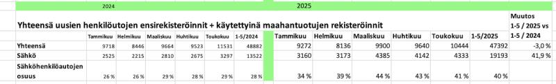 Tammikuun alusta toukokuun loppuun vuonna 2025 Suomessa on ensirekisteröity uutena yhteensä 10 236 sähköhenkilöutoa (BEV), mikä on hyvällä 18 prosentin kasvulla edellisen vuoden vastaavaan määrään nähden. Kaikkien uusien henkilöautojen ensirekisteröinneistä vastaavalla ajalla 34 prosenttia on ollut sähköhenkilöautoja, kun osuus edellisenä vuonna oli 27 prosenttia.