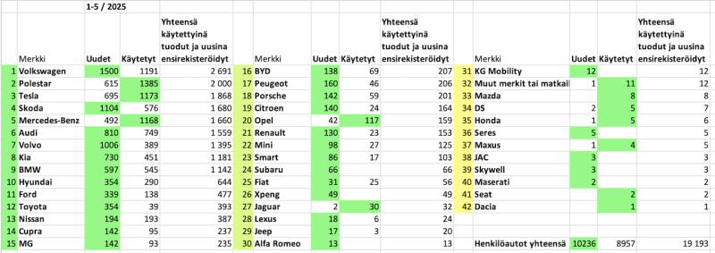 Kaikista 1-5 / 2025 Suomeen rekisteröidyistä sähköhenkilöautojen merkeistä yleisin oli Volkswagen 2691 autolla. Volkswageneista ylivoimaisesti suurin osa on ollut uusina Suomeen ensirekisteröityjä. Listalla toiseksi nousva merkki, Polestar 2000 kappaleella taasen on erittäin vahvasti käytettyinä rekisteörity auto. Samoin on kolmossijalle asettuneen Teslan sekä viidennelle sijalle asettuneen Mercedes-Benzin kohdalla.