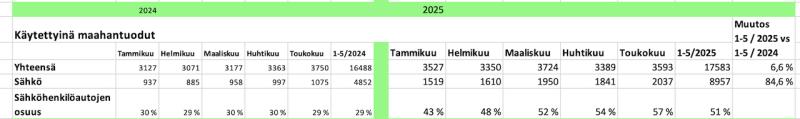 Tammi - toukokuuun 2025 aikana Suomessa rekisteröitiin 8957 kpl käytettyinä tuotuja sähköhenkilöautoja, mikä oli peräti 85 % enemmän kuin vuotta aiemmin samalla ajanjaksolla. Samalla se oli 51 % kaikista käytettyinä maahantuoduista henkilöautoista. Etenkin käytettyinä maahantuoduissa sähköautot tuntuvatkin olevan nyt erityisen suosittuja.
