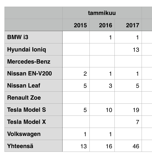 Sähköautojen rekisteröintimäärä lähes kolminkertaistui tammikuussa 2017 edellisen vuoden tammikuuhun verrattuna nousten peräti 46 kappaleen tasolle. Tämä on hyvä alku vuodelle, jota väritti ministeri Bernerin julkaisema liikennekaariesitys. Toki näihin tammikuun rekisterintimääriin tuo epävarmuus ei vielä kovin paljoa ehtinyt vaikuttaa.