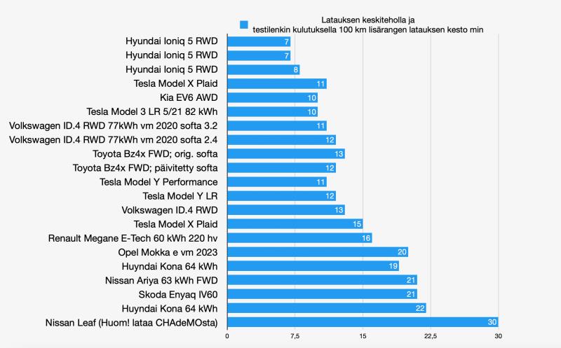 Kuvaajassa latauskerroittain autojen tarvitsema latausaika saadakseen 100 km lisää toimintamatkaa. Laskennassa tämän testikerran kulutus ja latauksen keskiteho. Kyllä tässä kuvaajassa 800V autot nousevat omaan sarjaansa. Pienempiakkuiset jäävät enimmäkseen häntäpäähän.