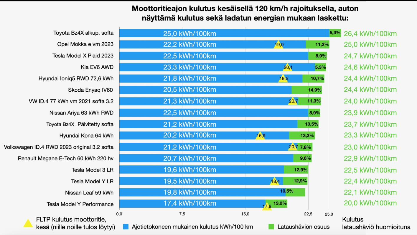 Testilenkin 123 km kulutukset. Sininen palkki kuvastaa auton ajotietokoneen ilmoittamaa kulutusta. Vihreä palkki päättyy ladatusta energiasta laskettuun kulutukseen. Kulutuslukemat myös lukevat kuvaajassa. Virheän palkin kohdalle olen merkinnyt lataushäviöt prosentteina. Olen myös lisännyt keltaiset kolmiot niille autoille, joille löysin kesäisen moottoritieajon FLTP-kulutuslukeman. Huomiona vielä, että osalla autoista on enemmän kuin yksi mittauskerta, jolloin lukema kuvaajassa on mittauskertojen keskiarvo.