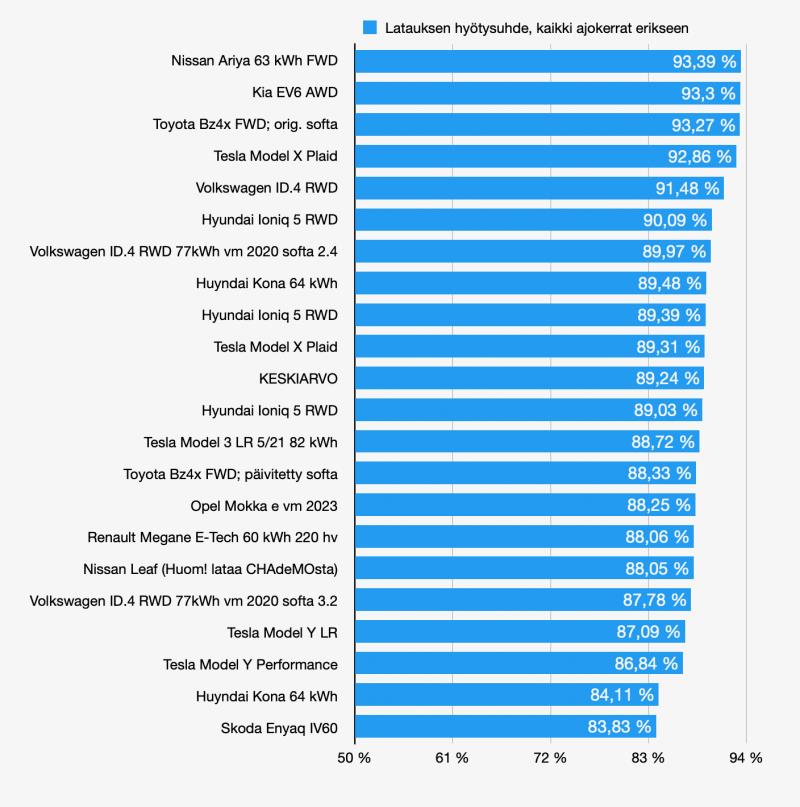 Testikertojen ja autojen latauksien hyötysuhteet testissä osoittavat, että kaikkien latauskertojen keskimääräinen hyötysuhde oli 89,24 %, mutta latauskerroista paras oli alle neljä prosenttiyksikköä keskiarvoa parempi ja toisaalta matalin hyötysuhde oli viisi prosenttiyksikköä heikompi kuin keskiarvo. Hajonta siis on aika pientä ja lisäksi esimerkiksi ID.4 -latauskertojen välillä eroa oli 3,7 prosenttiyksikköä.