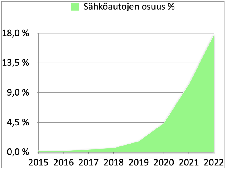 Sähköautojen osuus ajalla kaikista uusien henkilöautojen ensirekisteröinneistä on noussut vuosittain kiihtyvällä tahdilla ja oli vuonna 2022 jo18 %. Joulukuussa 2022 sähköautojen osuus oli ennätyskorkea, peräti 30 %.