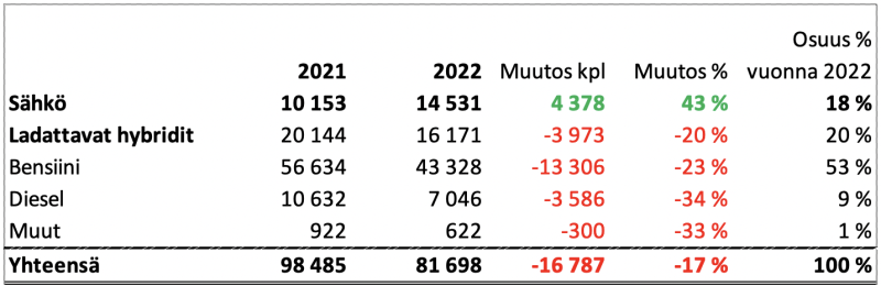 Uusia sähköautoja (BEV) ensirekisteröitiin vuonna 2022 Suomeen 14 531 kappaletta, joka oli peräti 43 % kehityksellä edellisen vuoden rekisteröintimäärään verrattuna. Se on erittäin suuri kehitys, kun huomioidaan, että kaikkien henkilöautojen rekisteröintimäärä oli peräti -17 %.