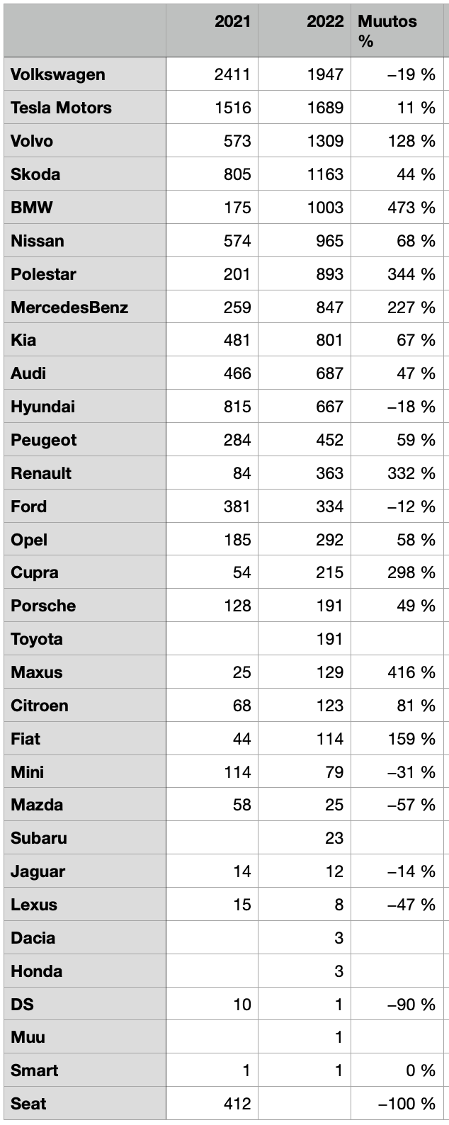 Koko vuoden 2022 aikana Suomen toimituksiin ei ehtinyt uusia sähköautoja valmistavia merkkejä oikeastaan kuin Toyota ja Subaru. Vastaavasti Seat-merkillä ei enää viime vuonna rekiseröity yhtään sähköautoa. Jo Euroopassa olevia mm kiinalaisia automerekkejä ei siis uusia vielä viime vuonna Suomeen rantautunut yhtään kappaletta.