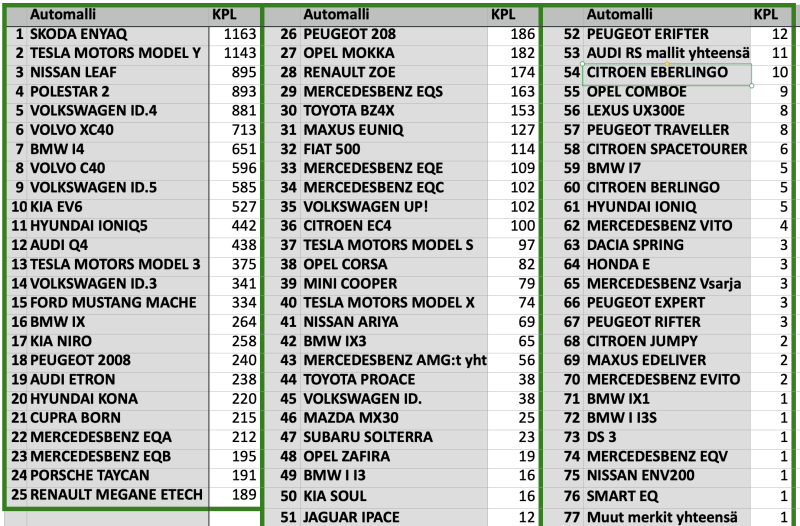 Traficom rekisteröintitilastossa eri automalleiksi kirjautuvia sähköautoja oli viime vuonna 77 erilaista. Näistä eniten rekisteröitiin Skoda Enyagia. Toisena oli Tesla Model Y ja kolmantena Leaf.