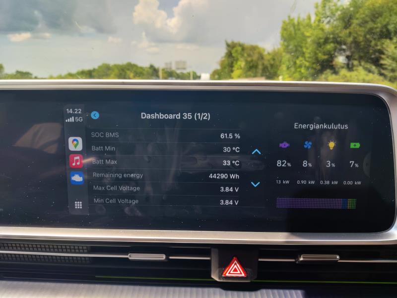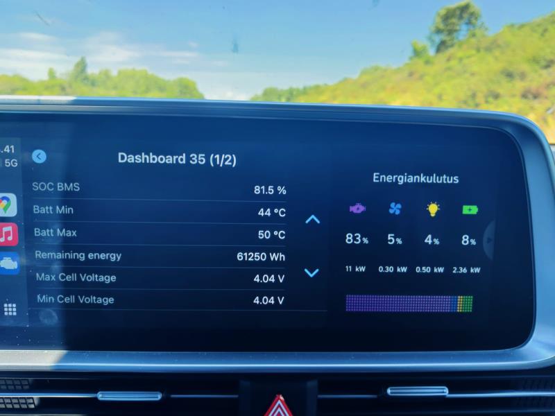 Tarkkailin mielenkiinnosta myös välillä akuston lämpötiloja sekä auton käyttäytymistä siihen liittyen. Helteisessä kelissä suurhteholatauksen jälkeen akuston lämmöt olivat +44..+50°C tasolla ja auto jäähdytteli akustoa jopa yli 2,3 kW:n teholla peräti noin 45 minuutin ja 84 kilometrin moottoritieajon verran, kunnes akuston lämmöt saavuttivat noin +30..+33°C tason, mikä oli muuten sillä hetkellä kylmempi, kuin ulkoilman lämpötila varjossa.