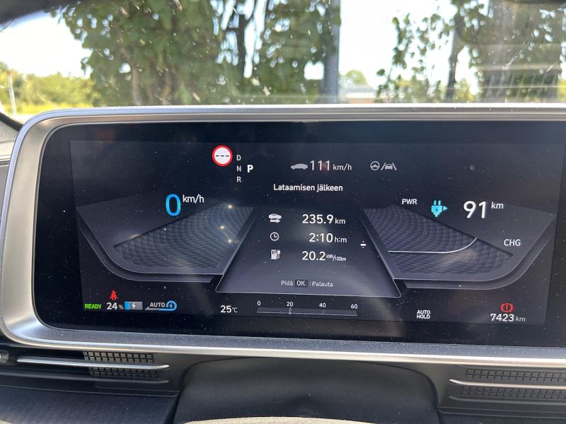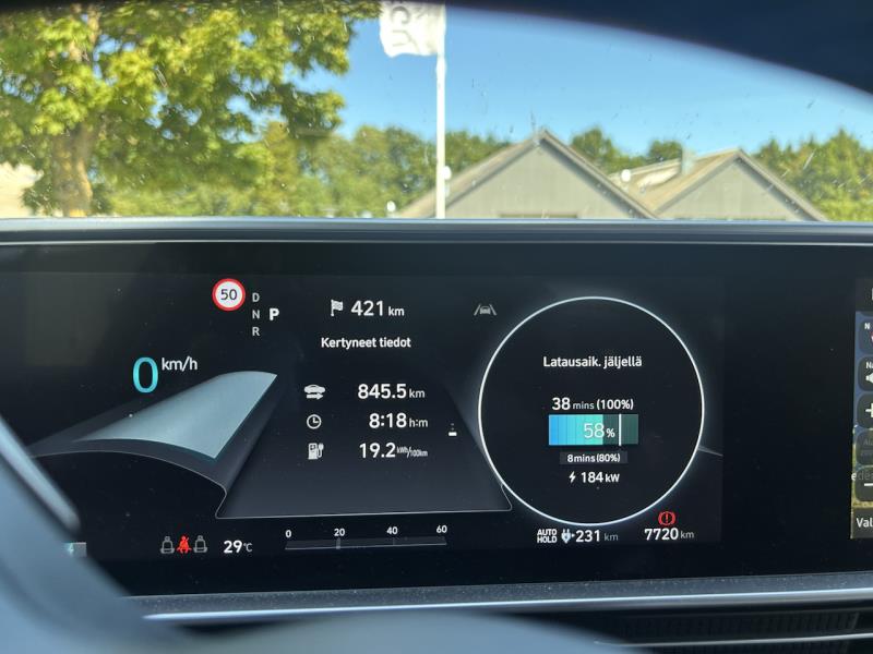 Matkaa oli kertynyt noin 313 km ja noin kello 9.55 aloittelin latausta mobiilisovelluksella Ionityn asemalla. Keskikulus näytti toteutuvan tällä välillä 19,4 kWh/100km lukemaa. Ioniq 6 on hyvä auto lataamaan etenkin kun huomioi, että se on jo vuonna 2023 Suomessakin esiteltyä tekniikkaa, eli ei enää edusta edes parasta kärkeä. Latausteho kiipesi jällleen nopeasti yli 220 kW:n tasolle.
