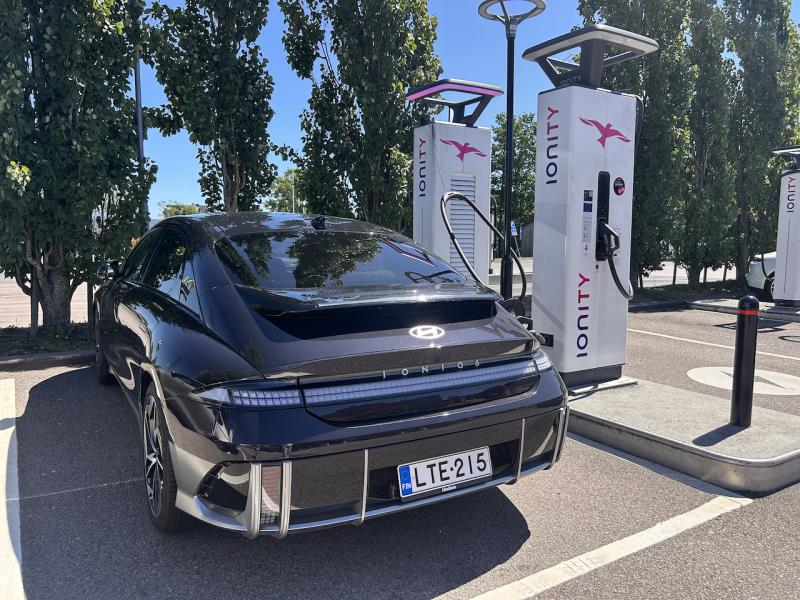 Auto laitettiin jälleen kiinni Ionityn laturiin mobiilisovelluksella tehdyn käynnistyksen jälkeen. Käytin Ionityn omaa sovellusta, koska olin tehnyt sinne 7,99 euron tarjoushintaisen kuukausisopimuksen, jolla latauksen kilowattituntihinta putosi merkittävästi. Harmillisesti Ionity-sovellus on jossain vaiheessa päivittynyt sen verran vajavaiseksi tiedoiltaan, ettei siitä näe latausten kestoaikoja jälkikäteen, enkä huomannut niitä dokumentoida erikseen.