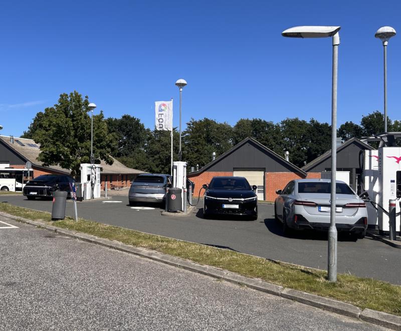 Auton mittariin kertyi 297 kilometriä lisää matkaa ja aikaa auton mukaan kului siirtymään 3 tuntia ja 5 minuuttia, eli ajamisen keskinopeus laski 98 km/h tasolle. Olimme siis Tanskassa ensimmäisellä laturilla noin kello 16.05. Auton mittariston mukaan keskikulutus edellisestä latauksesta oli 18,2 kWh/100 km.
