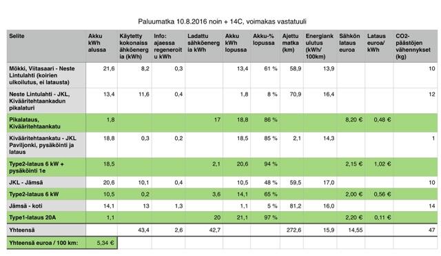 Paluu matkalla liikenne-energian hinta nousi vielä merkittävästi. Paluu matka maksoi 5,34 euroa/ 100 km, ja tuohon pääsee jo dieselautoistakin useilla.