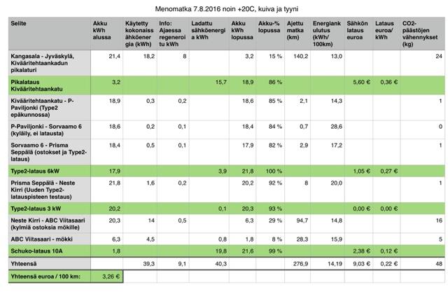 Menomatka (276,9 km) tuli maksamaan Leafilla 9,03 euroa, eli noin 3,26 euroa / 100 km. Tämä vastaa dieselin 11.8.2016 keskihinnalla 1,148e/l noin 2,9 l/100 km kulutuksisen dieselauton kulua. Noin pienen kulutuksen automaattivaihteiset dieselautot taitavat olla kylläkin aika harvassa. Silti harmillista, että hinnoittelu mudostuu noin korkeaksi.