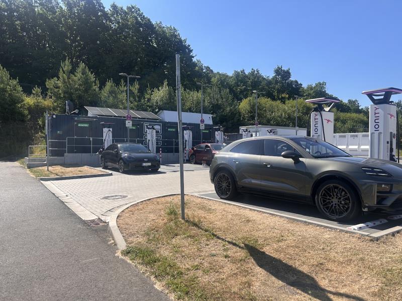 Ensimmäinen moottoritiesiirtymä oli vain 190 km pituinen ja vain 1 tunti 39 minuutin kestoinen, kun tarvitsimme jo ensimmäisen vessatauon sekä ehdottomasti lisää kahvia ja suolapalaa, niinpä pysähdyimme Knüllwaldiin Ionity-laturille. Tämän siirtymän keskinopeus hotellin parkista laturin parkkiin toteutui 115 km/h keskinpeudella ja auton mittaristo näytti keskikulutukseksi 26 kWh/100 km. Matkaa tehtiin aina liikenteen salliessa 180 km/h - 190 km/h ja matkan varrelle sattui lukuisia täysjarrutustarpeita hitaampien autoilijoiden siirtyessä varoittamatta eteen vasemmalle kaistalle sekä sen tien uudelleen vapautuessa täyskiihdytyksiä.