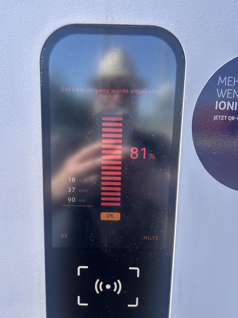Ioniq 6:den hyvästä latautuvuudesta kertoo paljon, kun sen lataus alkoi käytännössä aina yli 220 kW:n teholla, mutta vielä enemmän siitä kertoo se, että esimerkiksi täällä Knüllwaldissa se latautui vielä 81 % tasolla peräti 90 kW:n teholla. Lisäksi tämäkin peräti 37 % varaustasolla alotettu lataus oli 81 % tasoon kestänyt 18 minuuttia ja siinä ajassa oli sähköä toimitettu laturilta 37 kWh, eli 134 kW:n keskiteholla.