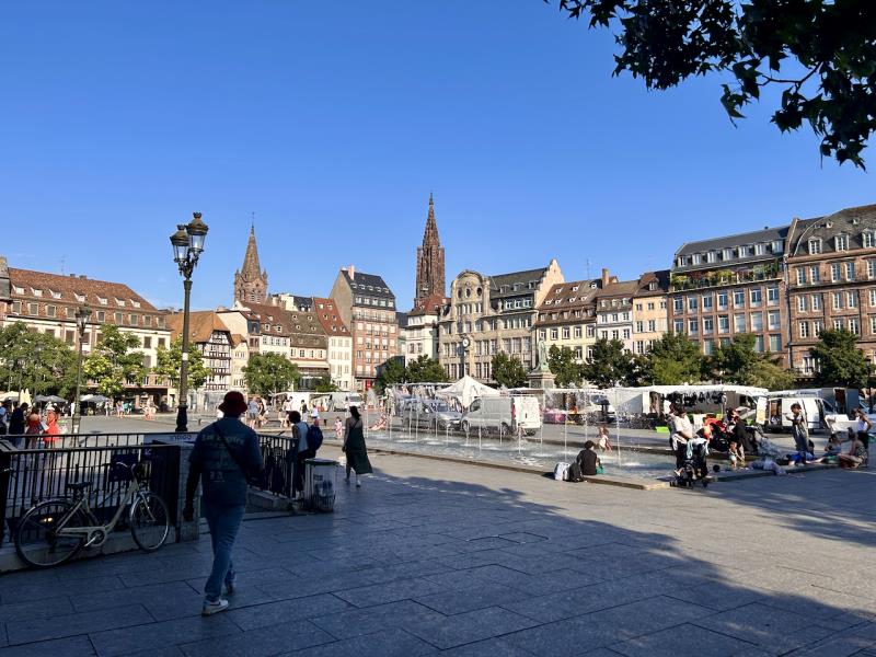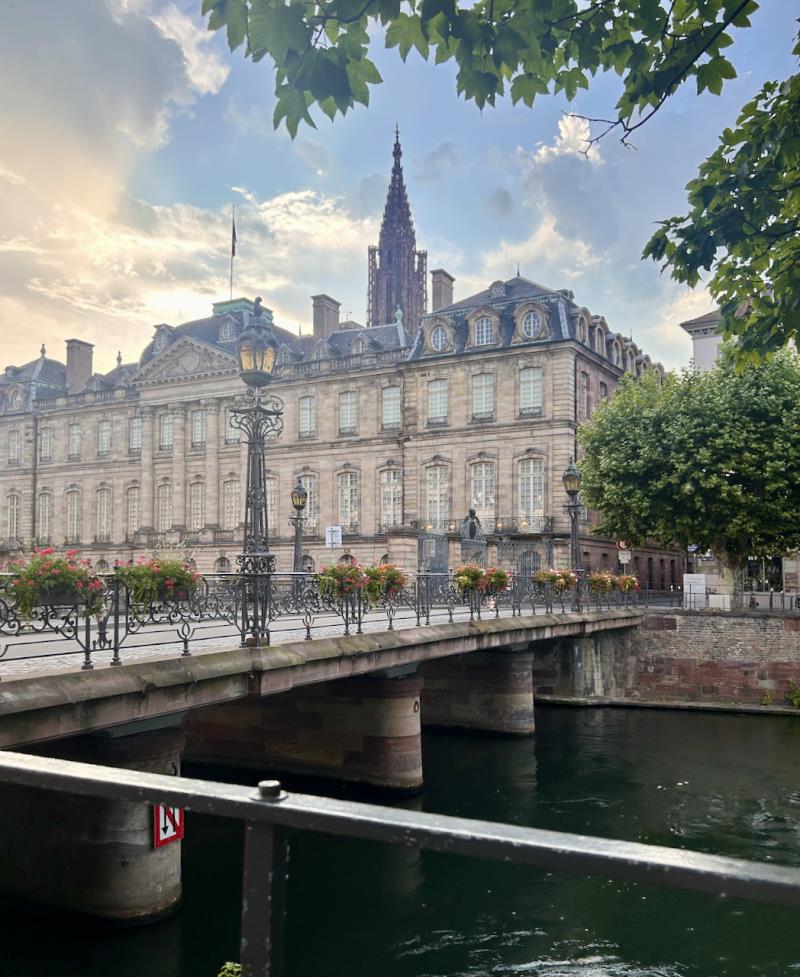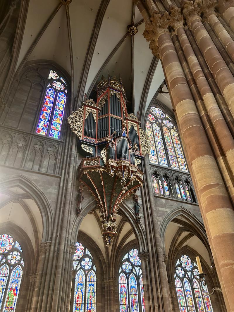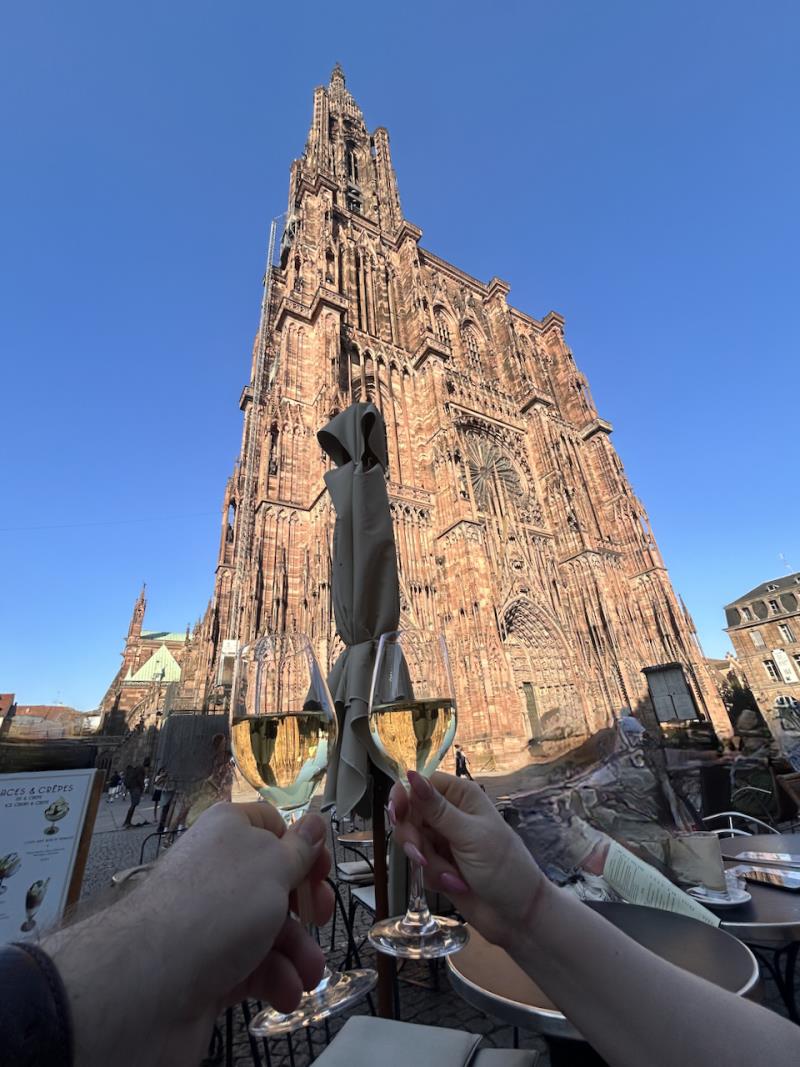 Strasbourgiin saapumisen päivänä, eli 2.7.2025 illallistimme vanhassa kaupungissa Ilen saarella ja ihailimme Strasbourgin Notre Damen aukion takana olevalta terassilta Riesling-lasillisten kera kyseistä kirkkoa, mikä muuten oli vuodesta 1647 alkaen peräti 227 vuoden ajan maailman korkein rakennus 142 metrin korkuisella tornillaan. 3.7. vierailimme siellä myös sisällä ja päädyimme sattumalta kuuntelemaan monesta maasta olevien sotilaiden hartaushetken loppuosuutta hiljaisina kuunnellen.
