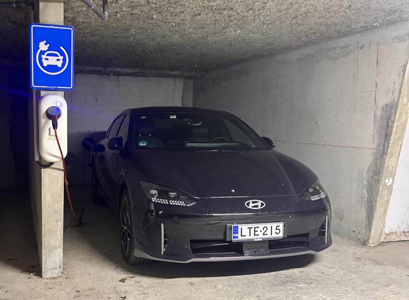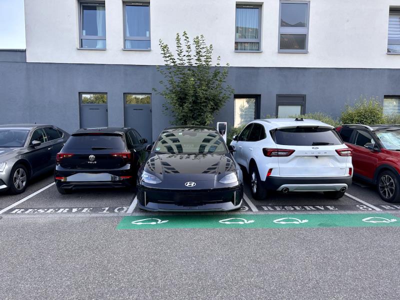 Strasbourgin K Hôtel parkkipaikalla Ioniq 6:den liikuttelu etänä avaimen avulla pääsi arvoonsa, nimittäin näin ahtaasta pysäkäintiruudusta en olisi millään ilveellä päässyt enää auton ovesta ulos tai sisään. Auto liikkui kuitenkin hienosti avaimella ulkopuolelta ohjaamalla ensin ruutuun ja sitten myöhemmin pois siitä. Kovin nopea tuo avaimella ulkopuolelta ohjaaminen ei ole, mutta luotettavan tuntuinen ja auto onneksi usktaltaa mennä erittäin ahtaaseenkin rakoseen sen avulla. (kuvassa ei välity aivan se realiteeti, miten ahdas tuo väli oli).