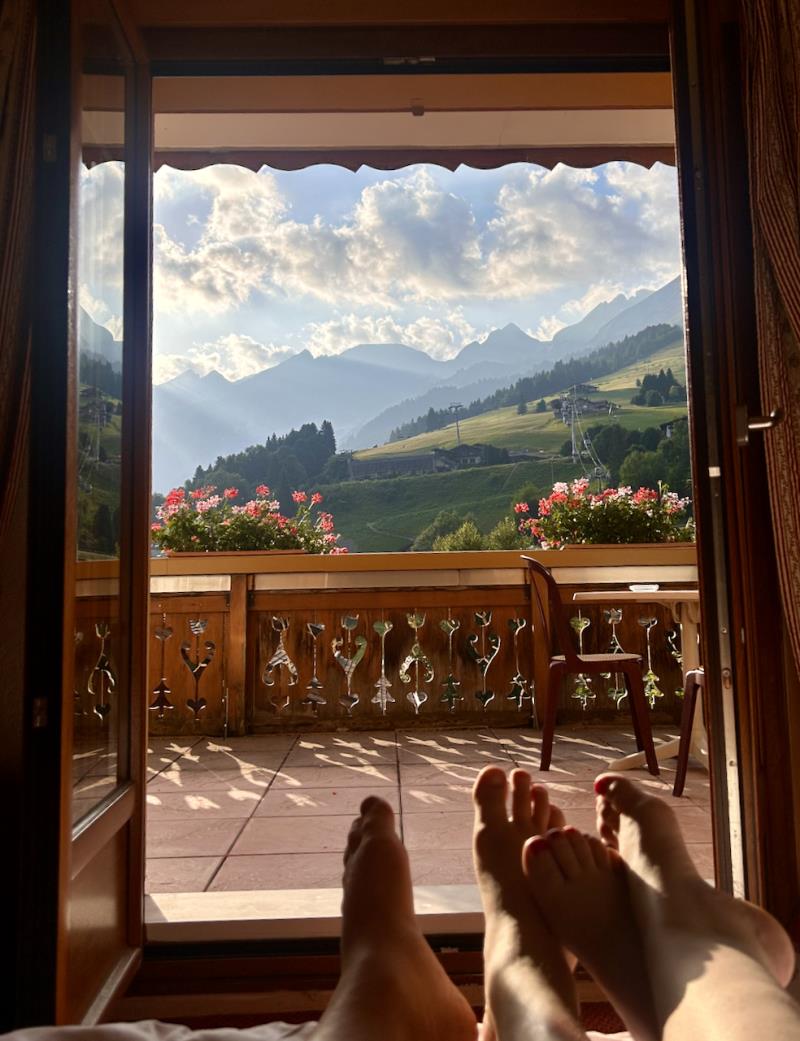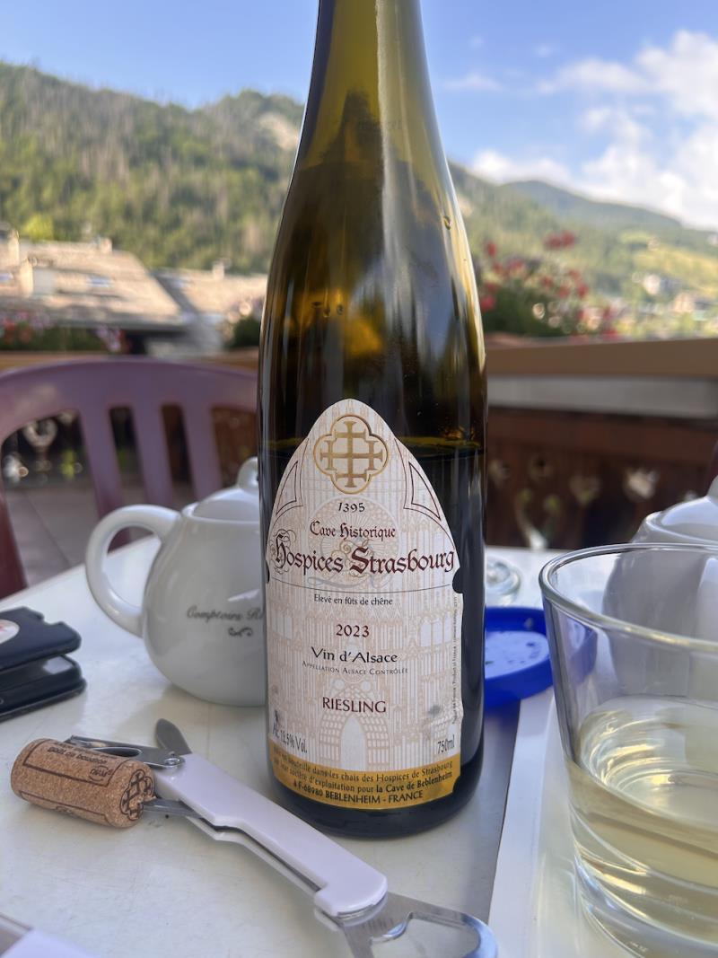 Tällä kertaa illallistimme upeassa näköalassa huoneemme valtaisalla parvekkeella. Ruoka oli Suomesta tuotua kuivaruokaa kuumaan veteen liotettuna, mutta sitä höystettiin senkin edestä hyvillä juustoilla sekä Strasbourgin sairaalan kellarista ostetulla Rieslingillä. Kyllä kelpasi, kuten myös aamulla herätä alla olevan kuvan maiseman valoistuessa avoimien ovien kautta Alppituulen viilentäessä huonetta.
